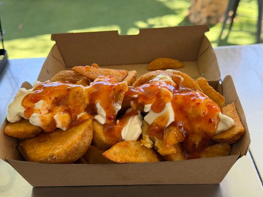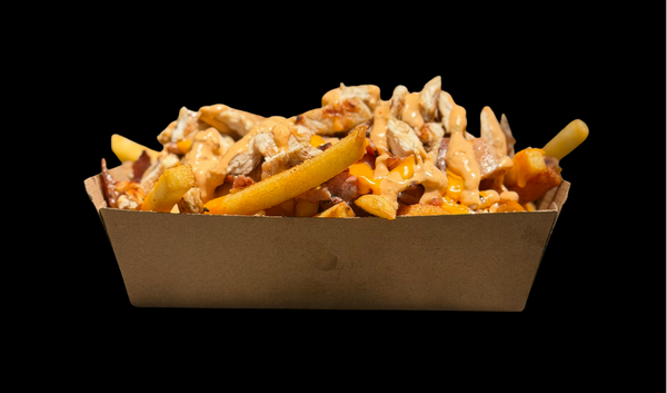Large Seasoned Chips, Grilled Chicken, Bacon, Melted Cheese, Burger Sauce