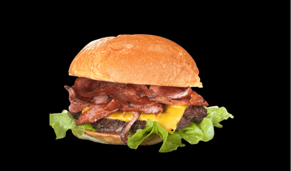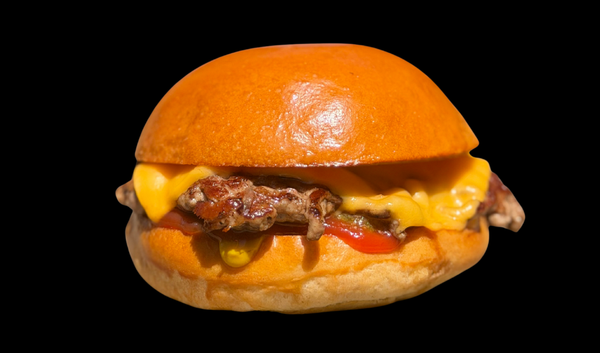 80g Potato Bun, Smash Pattie, Cheese, Bacon, Onion, Pickle, Ketchup and Mustard