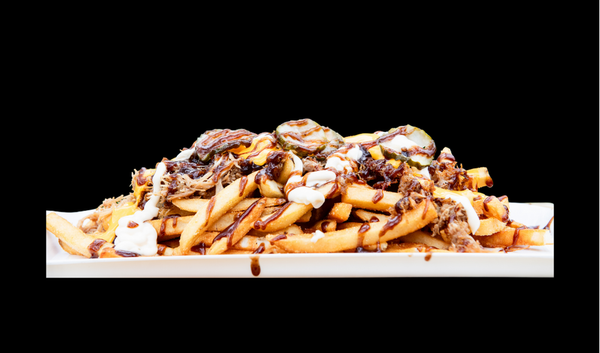 Seasoned Chips Loaded with Pulled Pork and your choice of 2 Sauces.